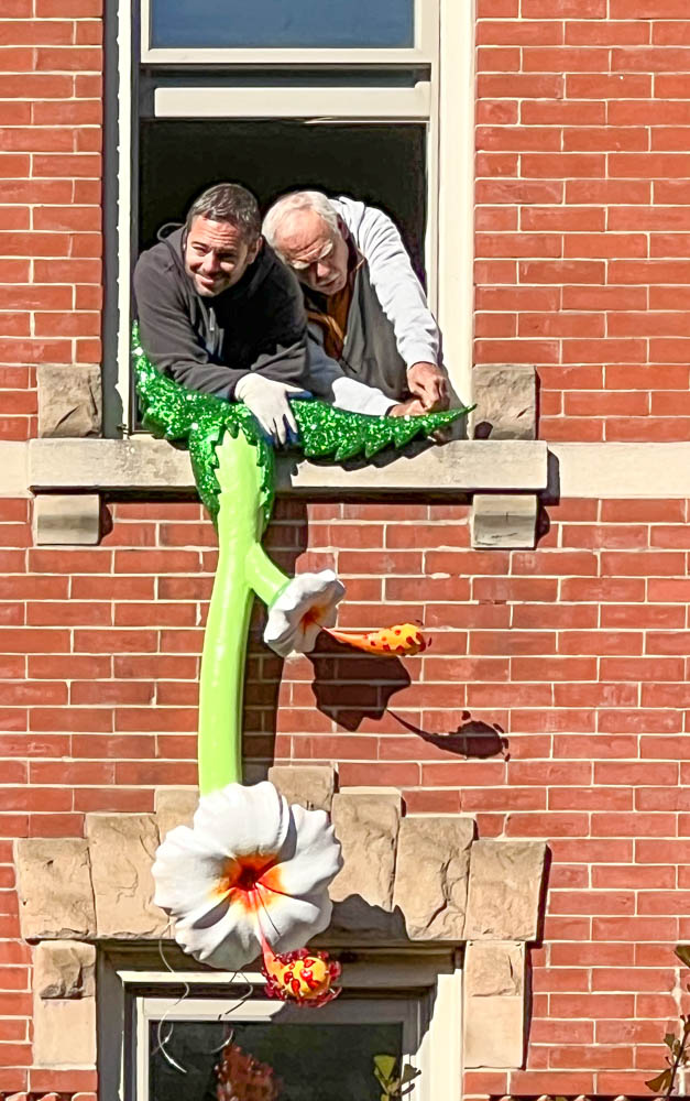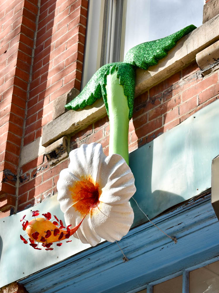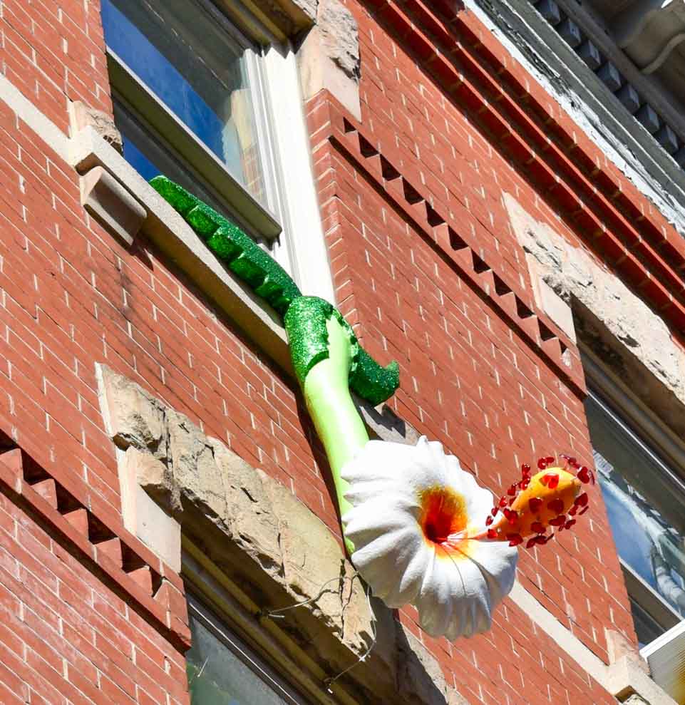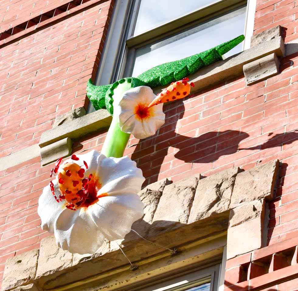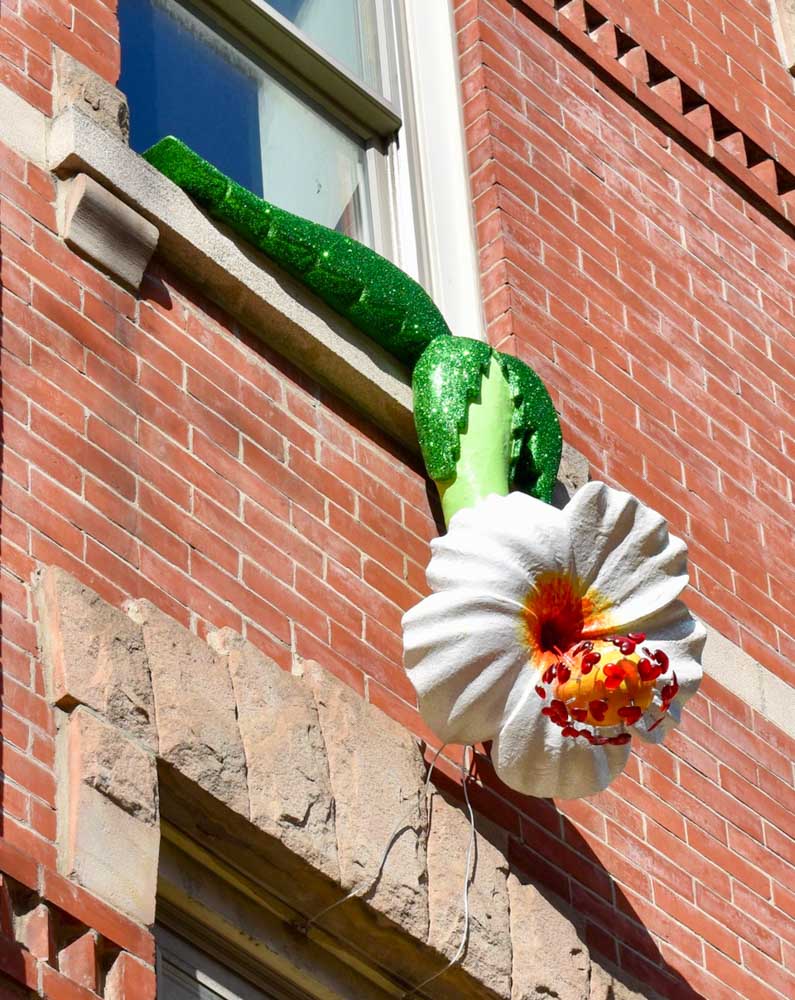 These pigeons are cast in Aqua Resin and covered in glitter and gold, grey, black, white and red enamel paint. They measure 12”H x 12”W x 4”D at the base